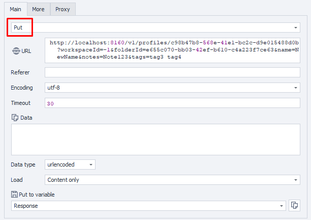 http://localhost:8160/v1/profiles/{profileId}?workspaceId=-1&folderId=a2f76986-8064-4c2f-b109-64a84b4ce137&name=NewName¬es=Note123&tags=tag1 tag2